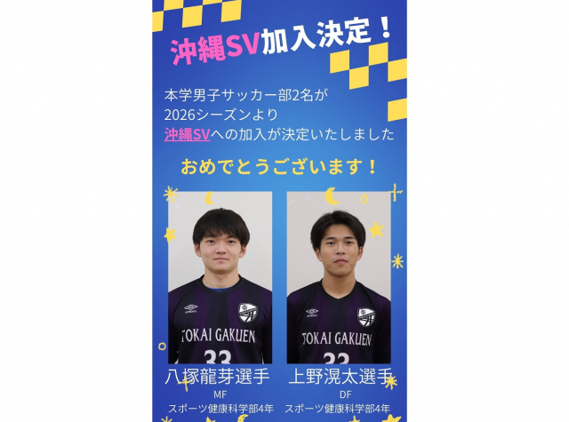この度、本学男子サッカー部 八塚龍芽選手(MF, スポーツ健康科学部4年/聖和学園高)・上野滉太選手( DF, スポーツ健康科学部4年/聖和学園高)の2026シーズンからの沖縄SVへの加入が決定いたしました。