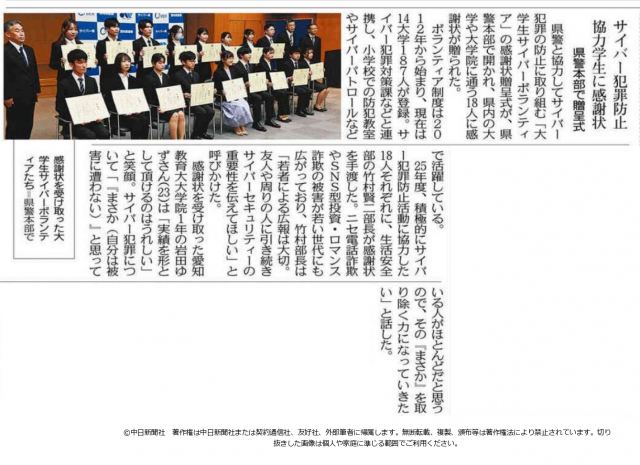 【ちぃむともいき】大学生サイバーボランティア活動で愛知県警察より感謝状