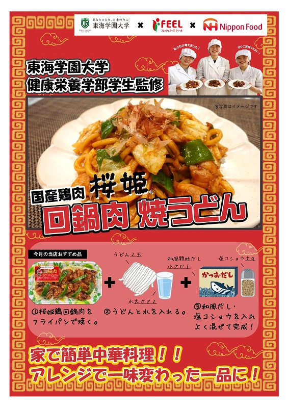 本学健康栄養学部の宮澤ゼミ、西田ゼミ(宮澤洋子教授、西田淑男教授)が株式会社フィールコーポレーション様、中日本フード株式会社様と開発を行った「国産鶏肉桜姫®を使用した鶏の回鍋肉」がフィール様全店舗で販売されることとなりました。期間は4/3(金)~4/30(木)です。