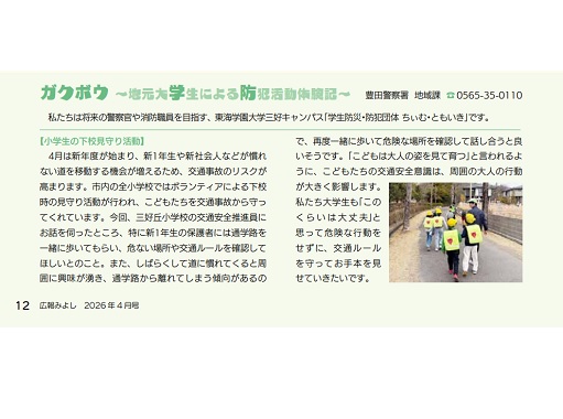 三好キャンパスで警察官・消防士を目指す学生サークル「学生防災・防犯団体 ちぃむ・ともいき」と豊田警察署がコラボレーションし、「広報みよし」で連載企画を行っています。防犯活動体験記「ガクボウ」のコーナーで、防犯など警察が担う取組みを学生目線で伝えています。