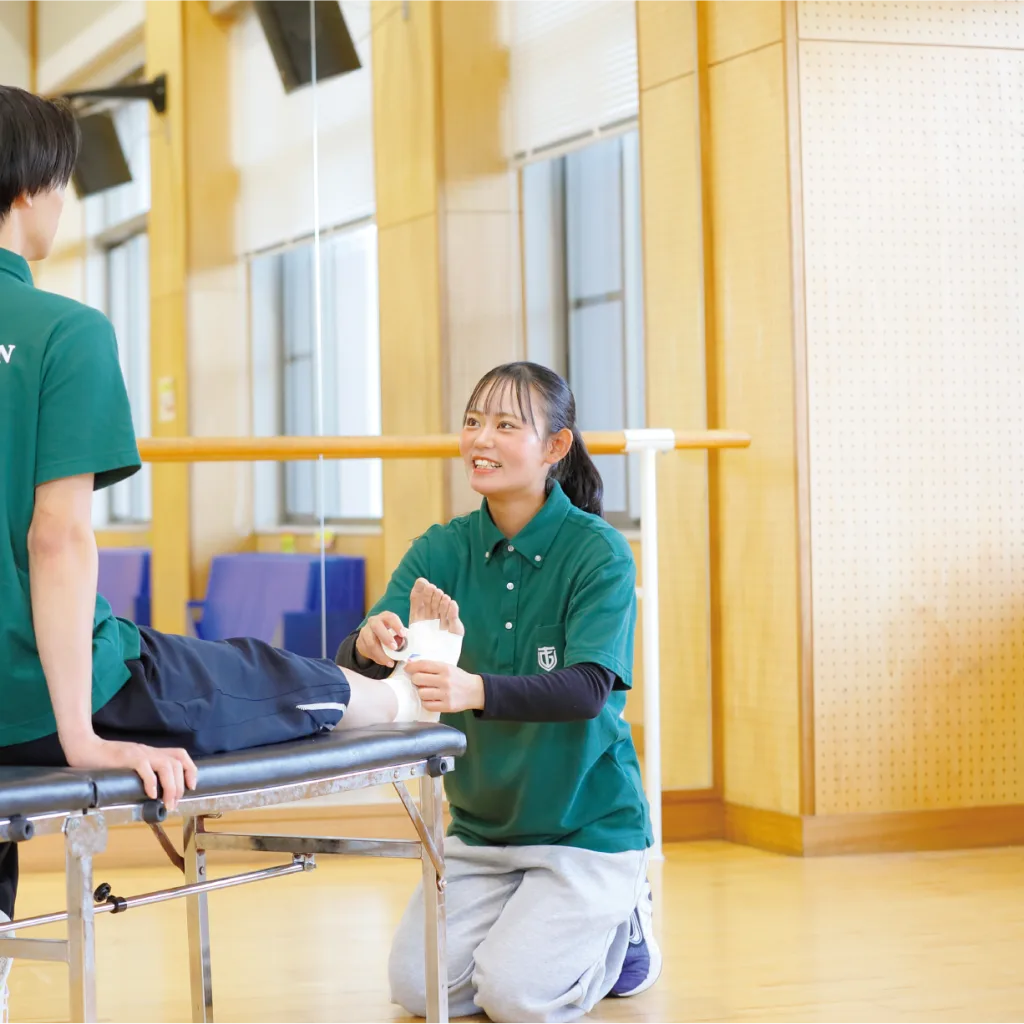 コンディショニングに関する授業では、テーピングやインソールについて学びました。テーピングは、巻き方を見て学び、自分の足で効果を確かめながら技術を身につけていきます。テーピングスキルの上達を実感し、先生に評価してもらえた瞬間の達成感は大きな励みです。インソールの役割を知ることで、競技中の身体バランスがパフォーマンスに直結していることを実感し、ケガの予防や改善につながる視点をもてました。